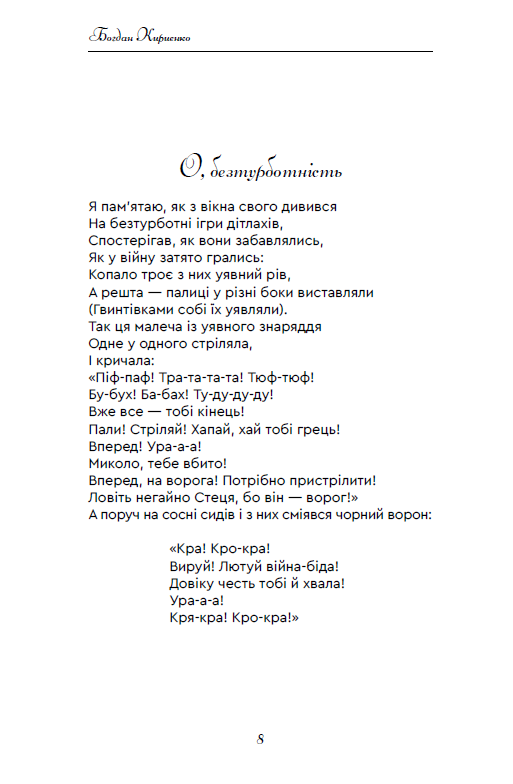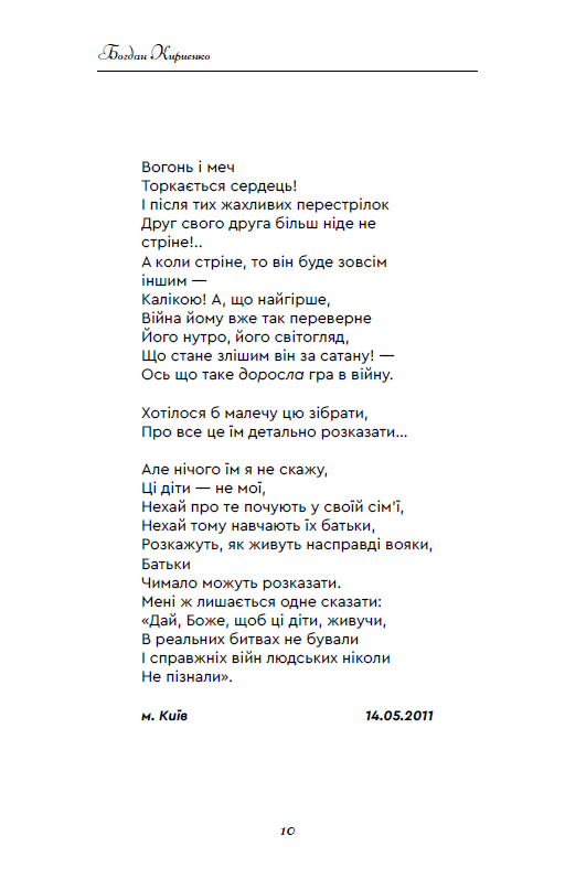 “Мистецтво — це віра. Поезія — віра. Як віруєш, так і віршуєш.” Автор книги часто повторює ці слова, і, як наслідок, вийшла в світ уже четверта його поетична збірка, наповнена великою кількістю актуальних різнопланових творів. Декотрі з них були написані під розривами снарядів і спалахами ракет.